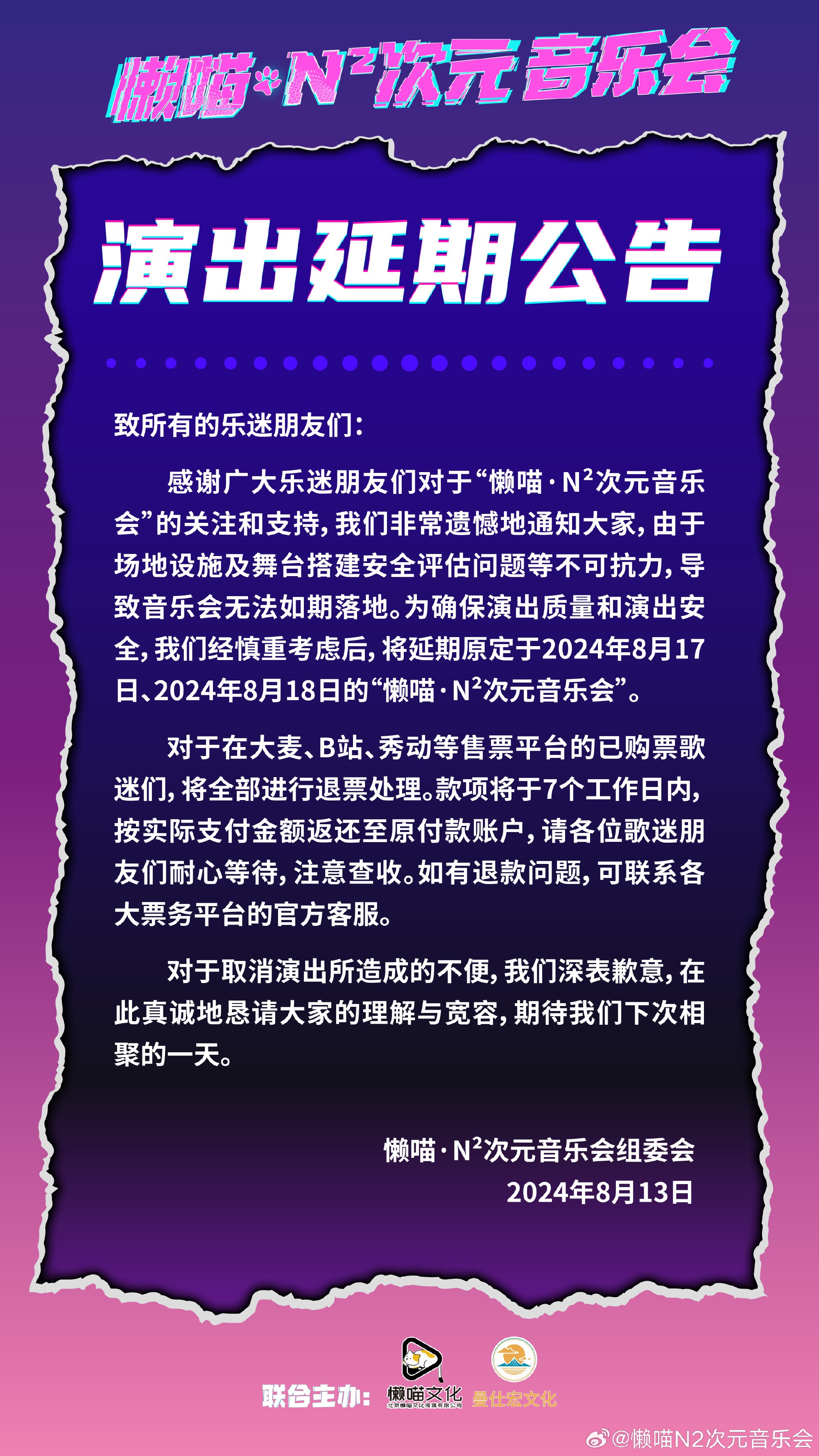 原定于本周末举行的 “懒喵 N2 次元音乐会 “演唱会延期。