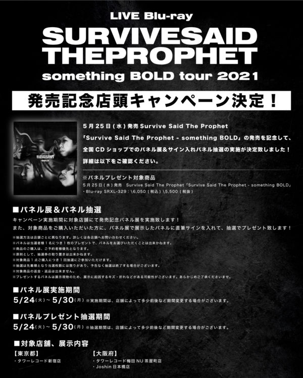 5月25日(水)発売Survive Said The Prophet「Survive Said The Prophet – something BOLD」の発売を記念して、全国CDショップでのパネル展&サイン入れパネル抽選の実施が決定致しました!詳細は以下をご確認ください。