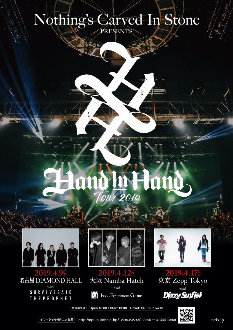 Date: 2019.04.09 Tue Title: Nothing’s Carved In Stone『Hand In Hand Tour 2019』 Venue: 名古屋DIAMOND HALL Ticket: ¥4,300 Open/Start: 18:00 / 19:00 オフィシャルHP(e+にて) http://eplus.jp/ncis-hp/2次受付期間:2/27(⽔) 22:00 〜 3/03(⽇) 23:59 問)JAILHOUSE TEL:052-936-6041