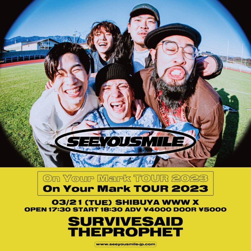 Date: 2023.03.21 Tue Title: See You Smile pre. On Your Mark TOUR 2023 Venue: 渋谷WWW X Ticket: 前売 ¥4,000 / 当日 ¥5,000 Open/Start: OPEN 17:30 / START 18:30 w/See You Smile e+:https://eplus.jp/seeyous