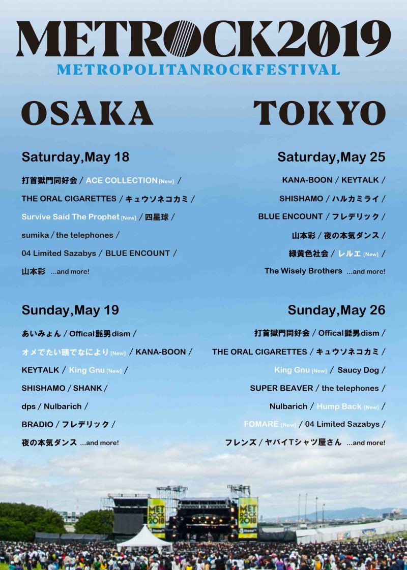 Date: 2019.05.18 Sat Title: OSAKA METROPOLITAN ROCK FESTIVAL 2019 Venue: METROCK大阪特設会場 Ticket: 5/18 1日券 ¥10,000(税込) Open/Start: OPEN9:00/START11:00(予定) Survive Said The Prophetの出演は18日の大阪のみとなります。 http://metrock.jp/