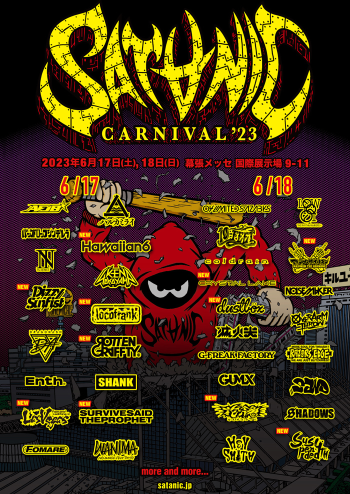 Date: 2023.06.17 Sat 11:30 AM – 9:10 PM Title: SATANIC CARNIVAL ’23 Venue: TOKYO 幕張メッセ 9~11ホール Ticket: 1DAY TICKET:9,800円 / 2DAY TICKET:18,500円 Open/Start: 17日(土) 開場 10:30 / 開演 11:30 / 終演 21:10(予定) <イベントオフィシャルサイト> https://carnival.satanic.jp <チケット情報> https://carnival.satanic.jp/2023/ticket