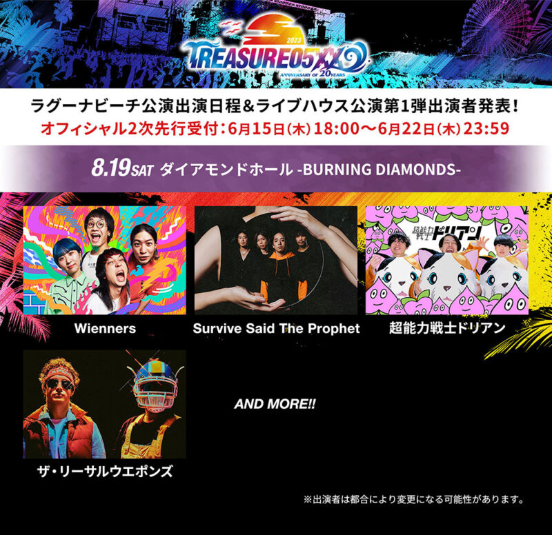 Date: 2023.08.19 Sat Title: TREASURE05X 2023 20th Anniversary ~BURNING DIAMONDS~ Venue: 名古屋ダイアモンドホール Open/Start: OPEN 12:15 / START 13:00 公式サイトはこちら https://www.treasure05x.jp/dia.html
